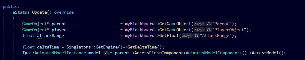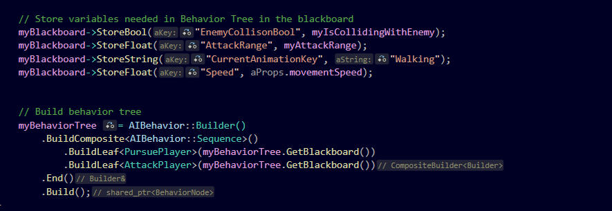 When coding the behaviors I also learned how to utilize the Blackboard pattern to help pass values between behaviors and outside the behavior tree.I am hoping to further develop the behavior tree in a future project and learn how to utilize Decorators to create more complex enemy behaviors.